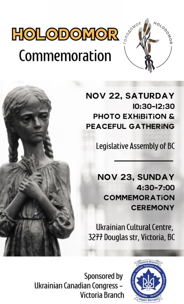 The Ukrainian Canadian Congress, Victoria Branch invites you to attend the Holodomor Commemoration on Sunday, November 23, 2025, to honour the memory of the millions of innocent Ukrainians who perished during the Holodomor (1932–1933) — the man-made famine orchestrated by the Soviet regime.